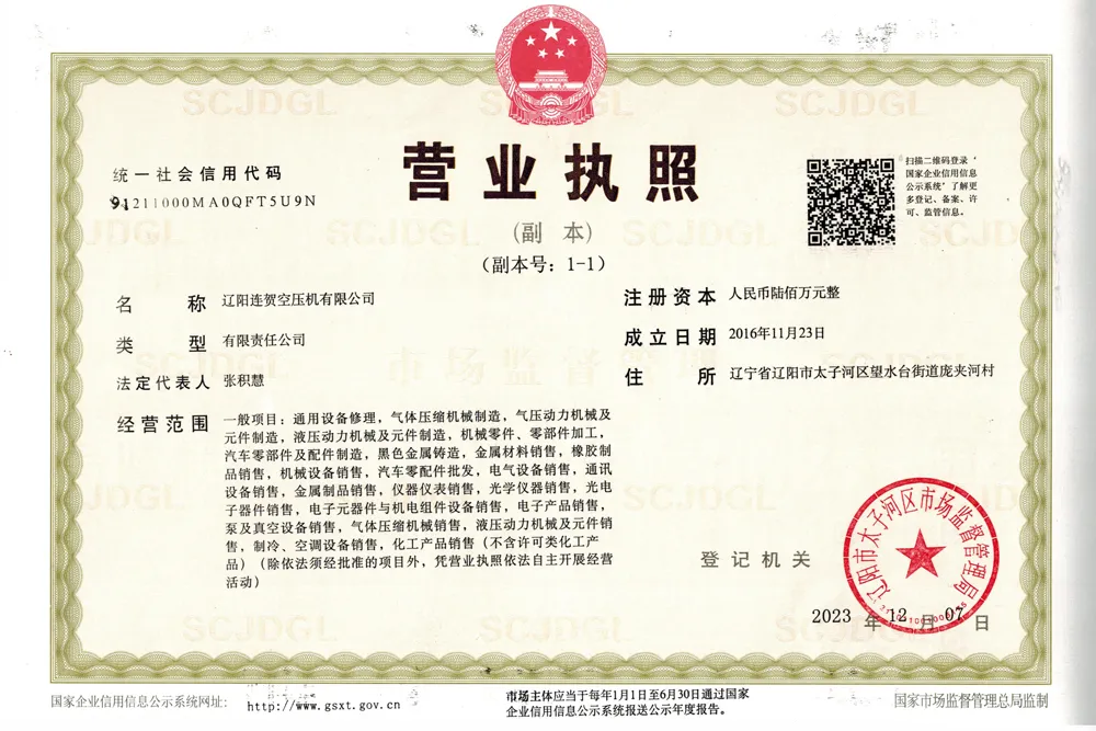 ООО Ляоян Ляньхэ Воздушный Компрессор базируется в живописном районе Тайцзыхэ города Ляоян, занимая площадь более 600 м² с уставным капиталом 6 млн юаней. Компания специализируется на производстве и ремонте компрессоров, турбокомпрессоров, автоматических регуляторов напряжения, пневмоэлектрических клапанов, электроклапанов, а также поставляет продукцию и комплектующие отечественным внешнеторговым компаниям. Также мы предоставляем индивидуальные услуги для удовлетворения особых потребностей клиентов. Основанная в 2008 году как «Ляоян Хэлинь Машиностроительный завод», в 2015 году она была переименована в «Тайцзыхэ Ляньхэ Машиностроительный завод», а 3 ноября 2016 года — в АО «Ляоян Ляньхэ Компрессор».